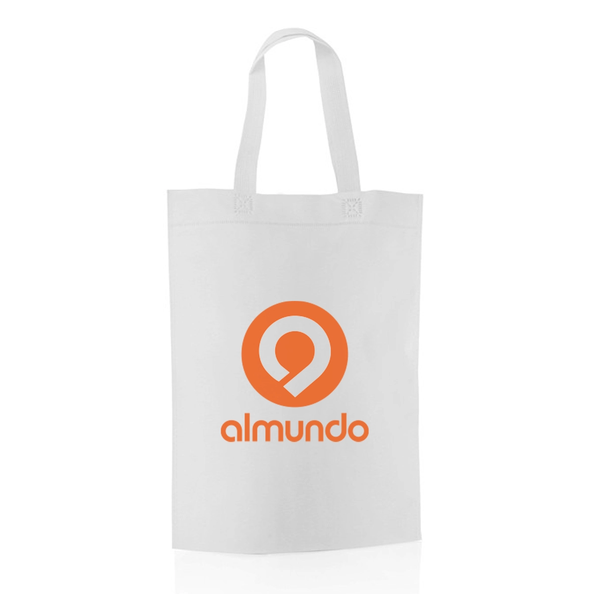 Ecobolsa de tela no tejida de distintos gramajes. Cuerpo y manijas de transporte de color blanco. Medidas: 30 cm. ancho x 40 cm. alto x 10 cm. de fuelle en la base.