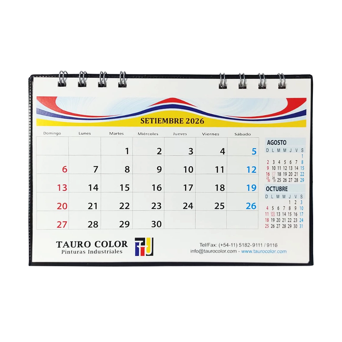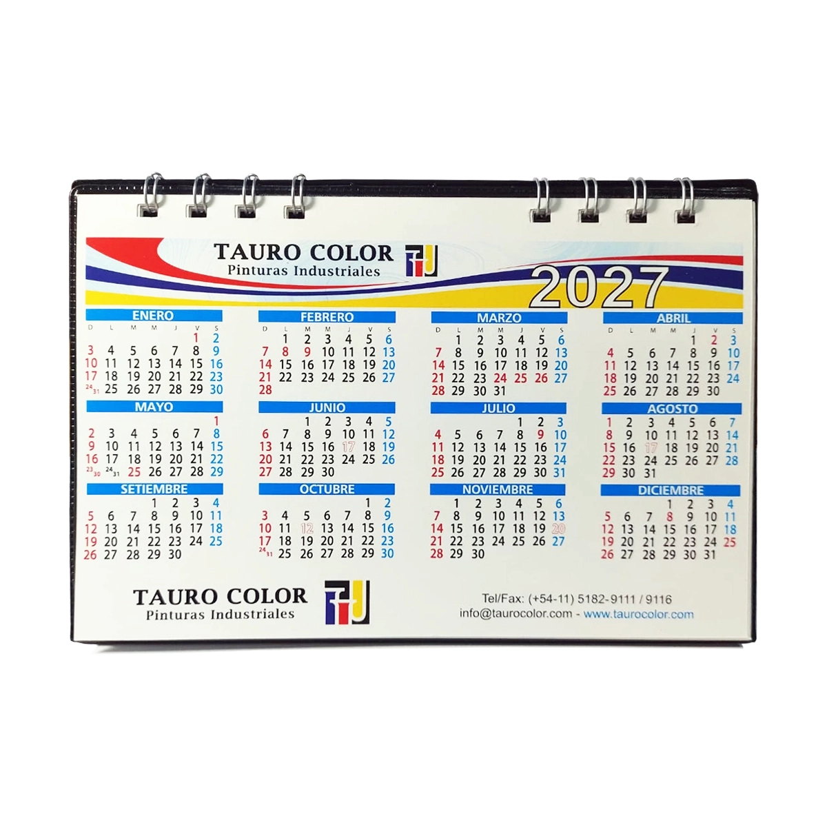 Calendario carpita con base de tela plástica de color, 13 hojas impresas en papel ilustración Full Color. Medidas: 18,5 x 12,5 cm.