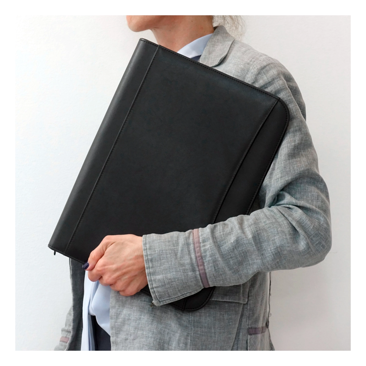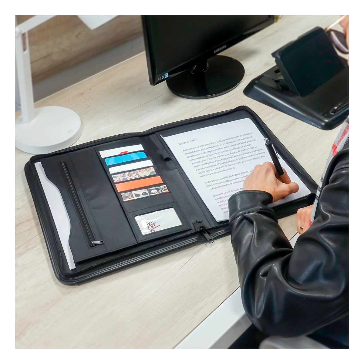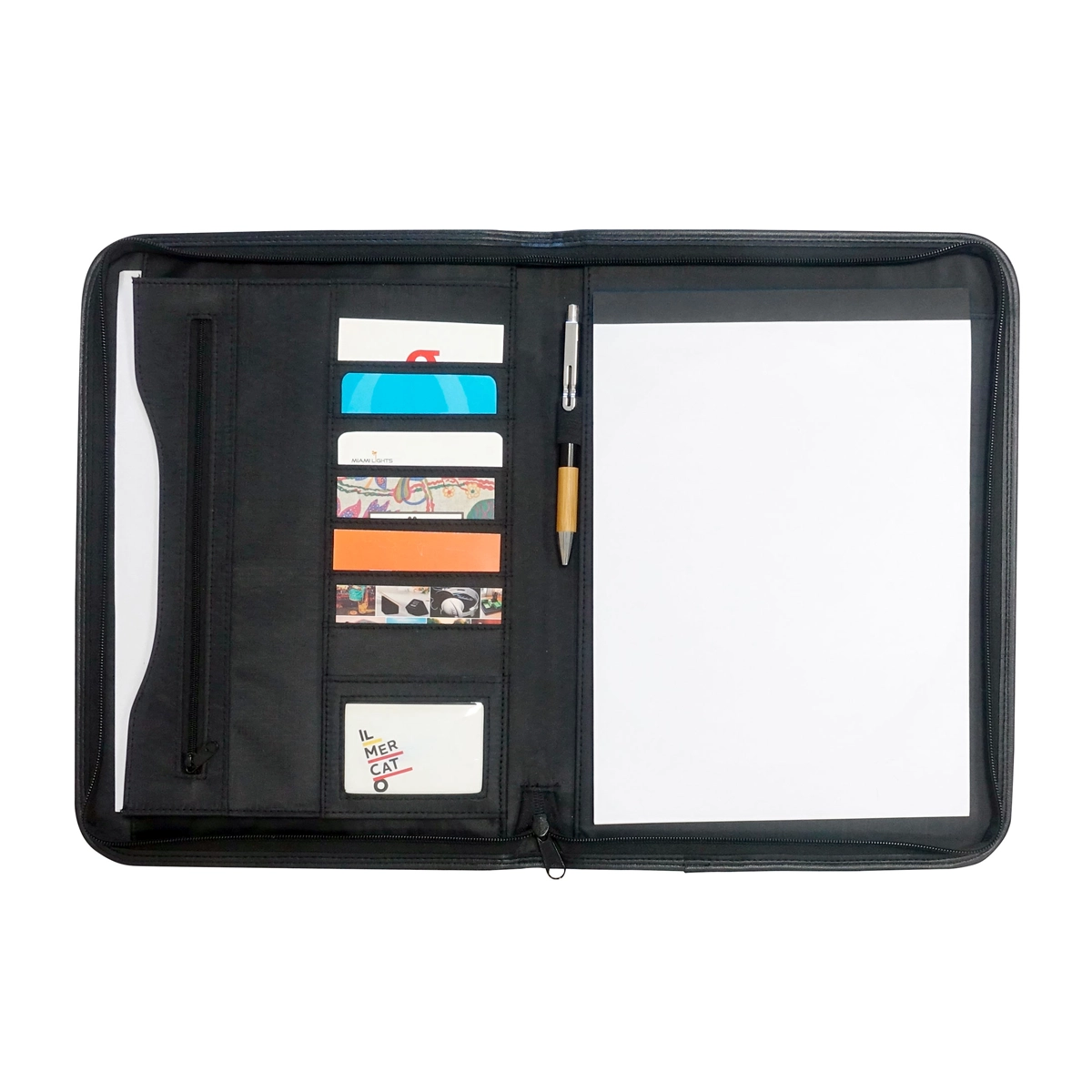 Carpeta con cierre perimetral SIMIL CUERO. Contiene 1 block de 20 hojas lisas tamaño A4. Porta bolígrafo. Bolsillo externo. Compartimentos internos para 7 tarjetas. Sobre con fuelle y bolsillo interno con cierre. Medidas: 26 x 35 x 3 cm.
