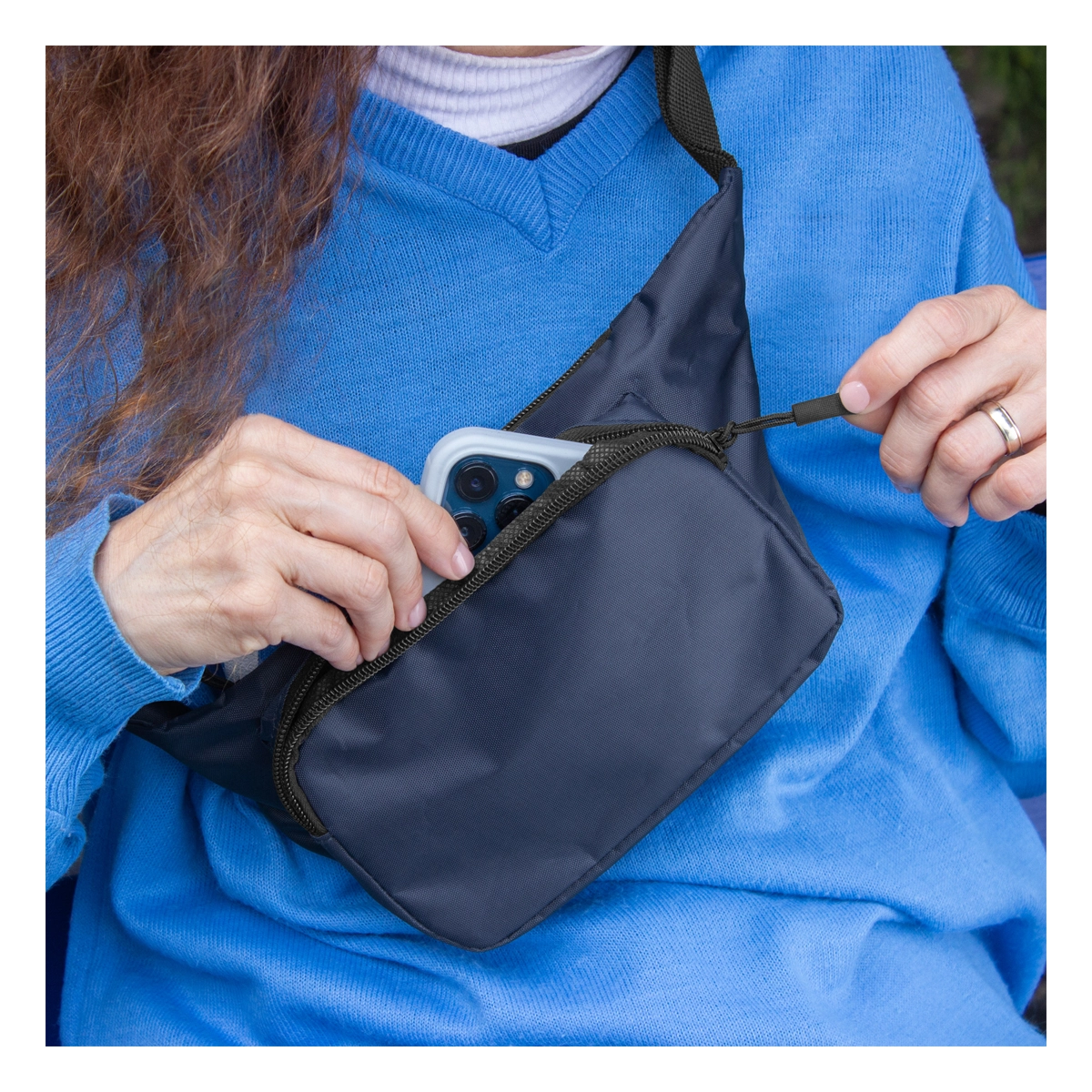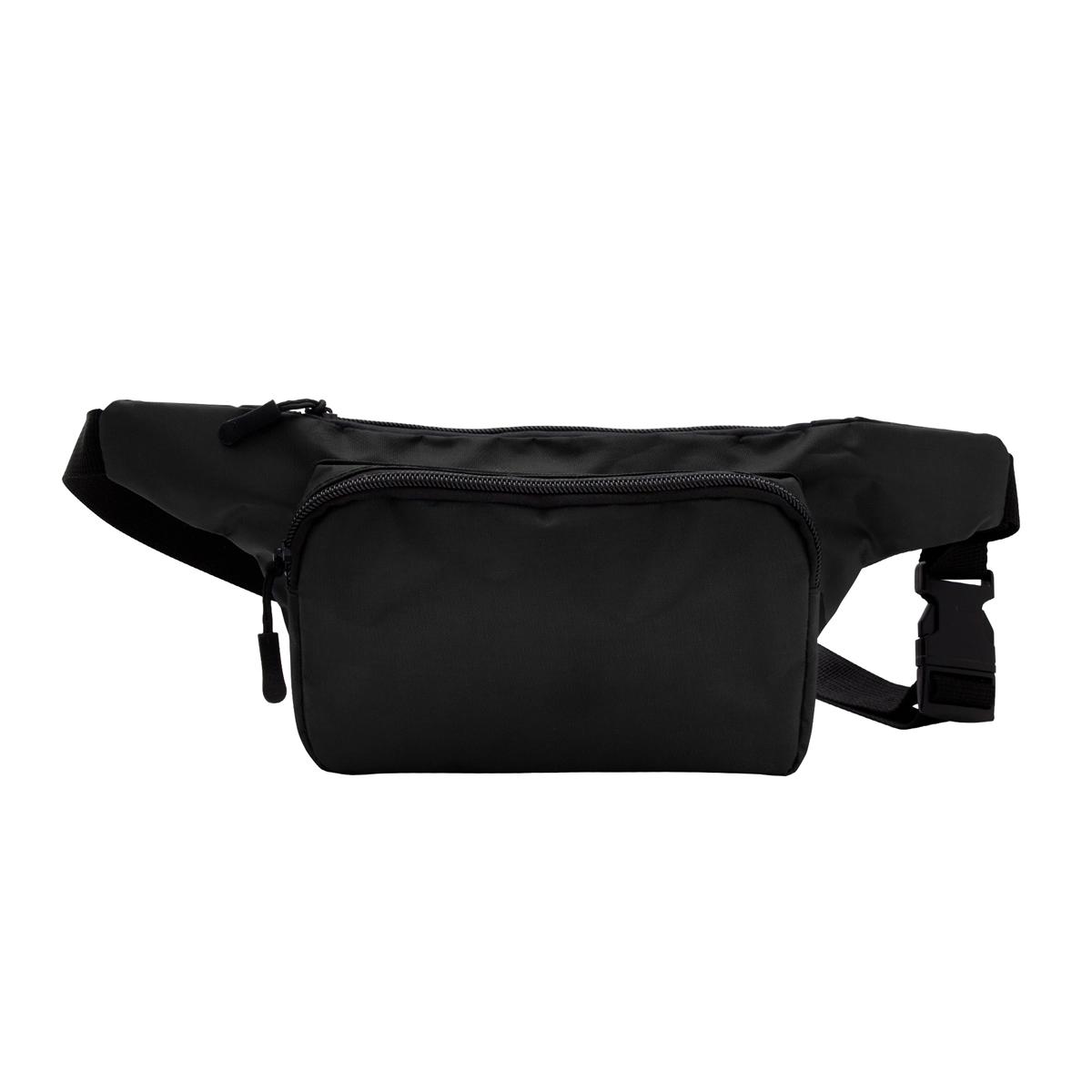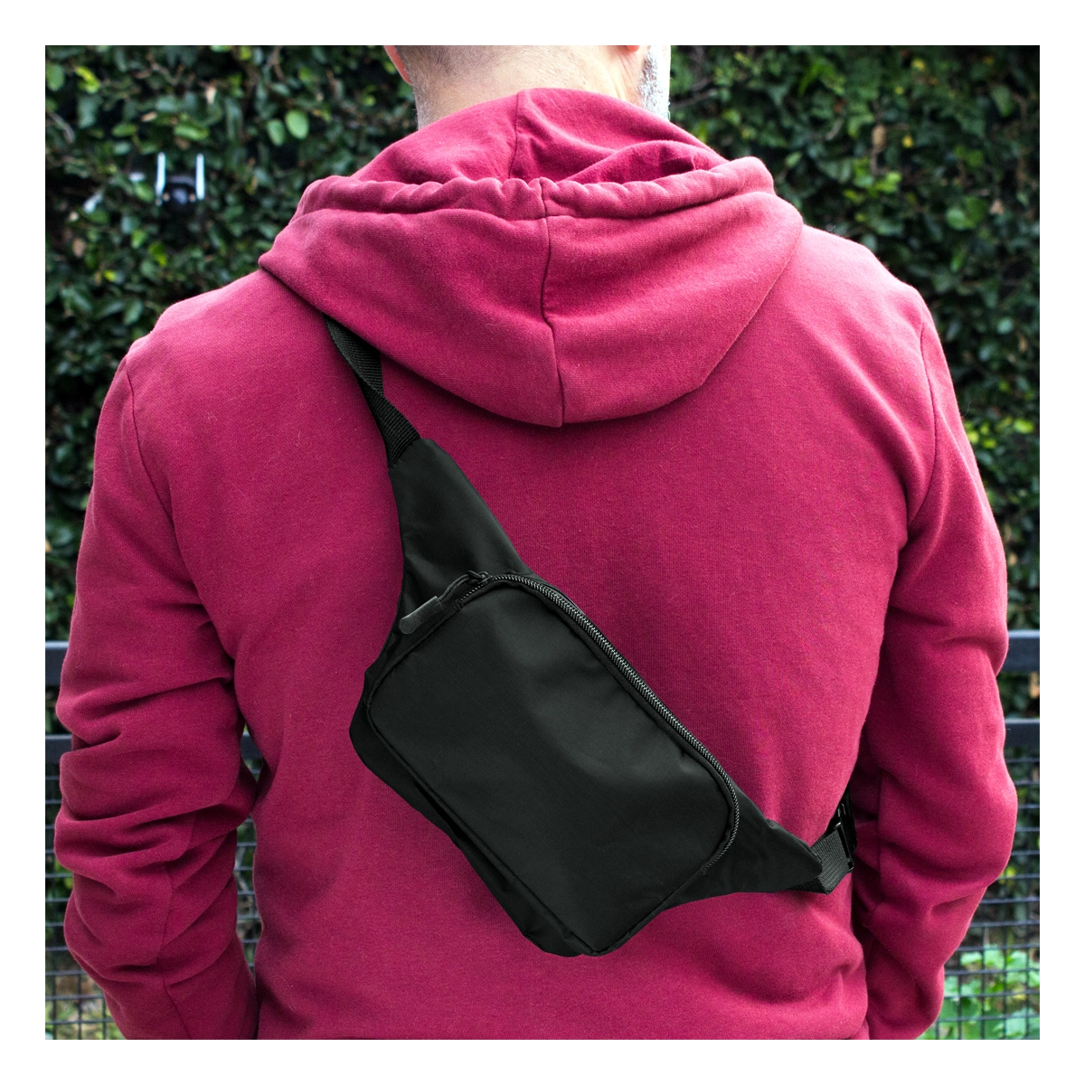 Riñonera con 2 compartimentos con cierre. Amplio bolsillo frontal. Correa ajustable con herrajes plásticos. Cierres y tiradores de cierre plásticos de color negro. Medidas: 34 x 14 x 7,5 cm.