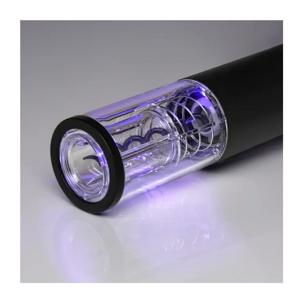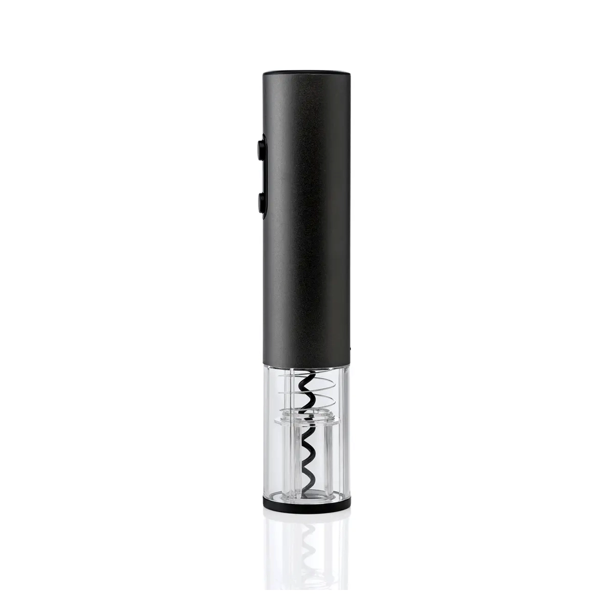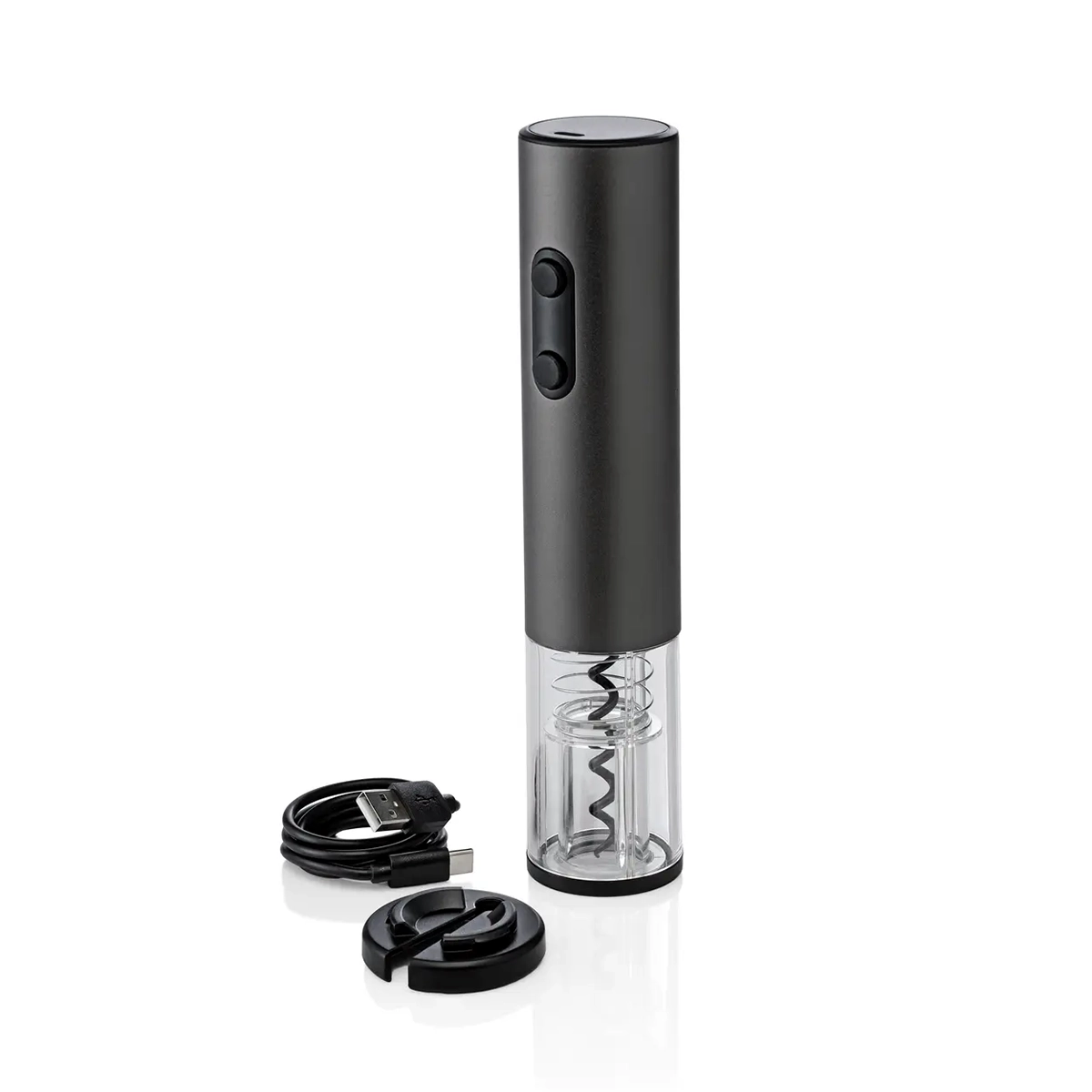 Sacacorchos con carcasa de aleación de aluminio cepillado. Botones de gel de silicona. Luz LED para una indicación clara. Proceso de apertura visible. Batería de litio de carga con cable USB-C. Cortador de papel de aluminio que también sirve como base. Medidas: 23,4 cm. x 4,5 cm. de Ø. Presentación: caja individual de cartulina impresa.