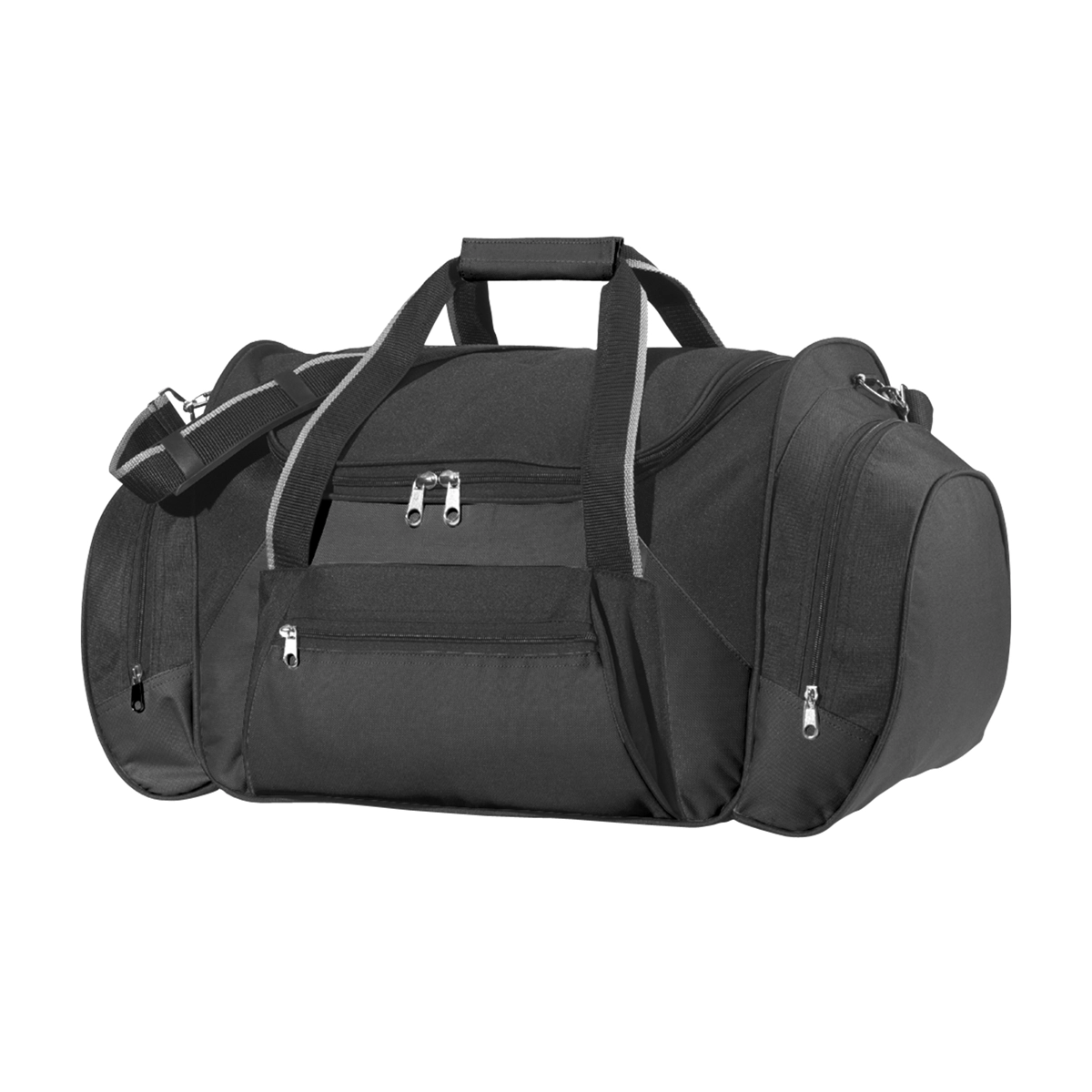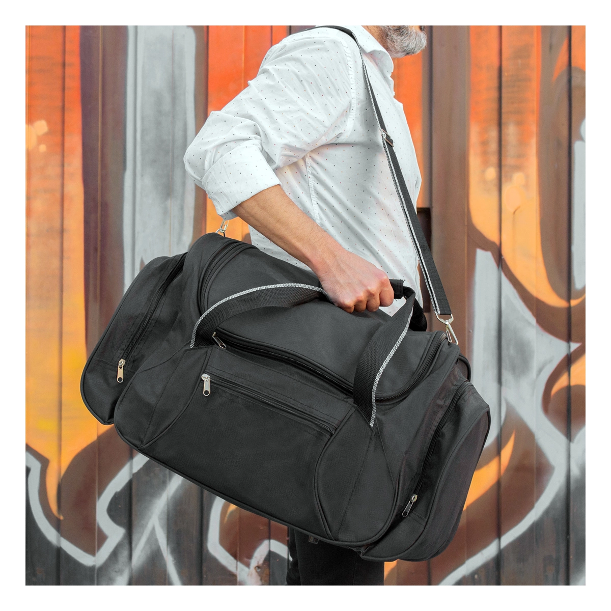 Bolso de viaje o deportivo, confeccionado en Poliéster 600D. Bolsillo frontal y compartimentos laterales externos con cierre. Apertura superior completa con cierre. Herrajes metálicos. Correa regulable y desmontable con hombrera de goma. Manijas con velcro. Capacidad: 45 litros aprox. Medidas: 60 x 33 x 29 cm.