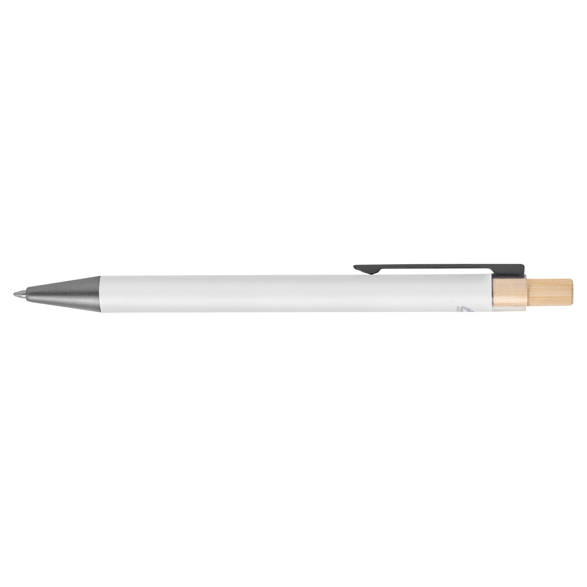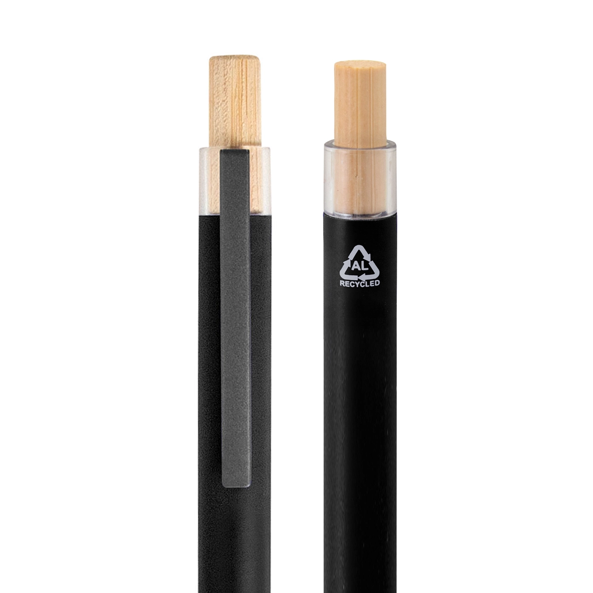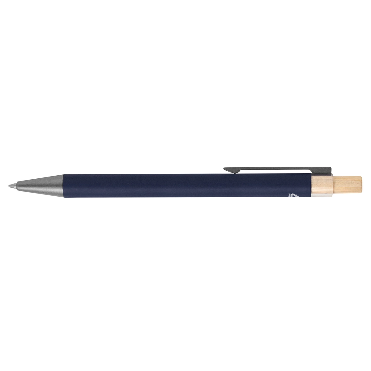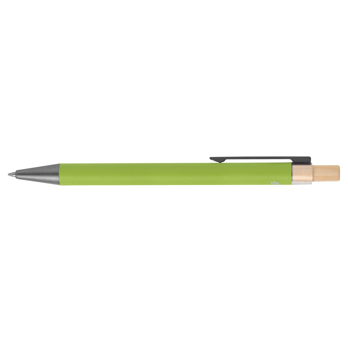 Bolígrafo metálico retráctil. Cuerpo de color acabado mate. Clip metálico y puntera plástica acabado mate. Pulsador de bambú. TINTA NEGRA. Medida: 14 cm.