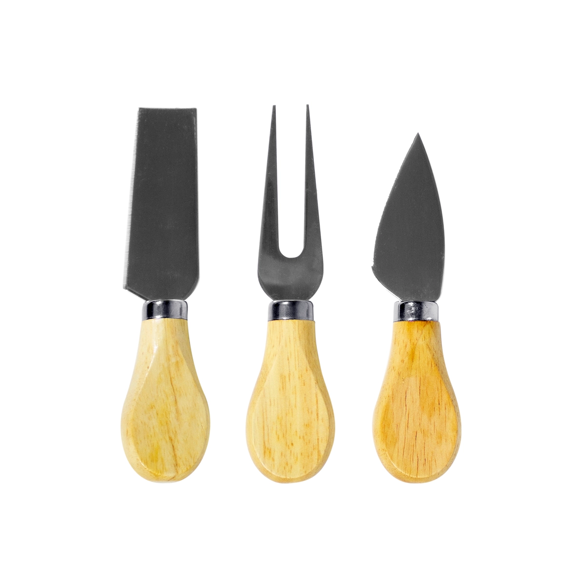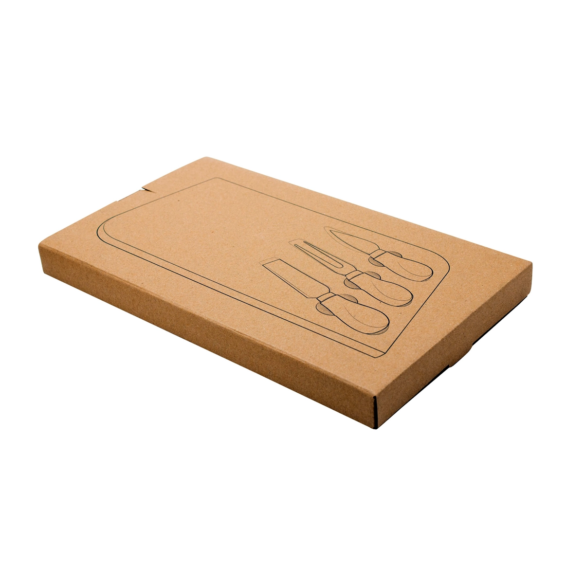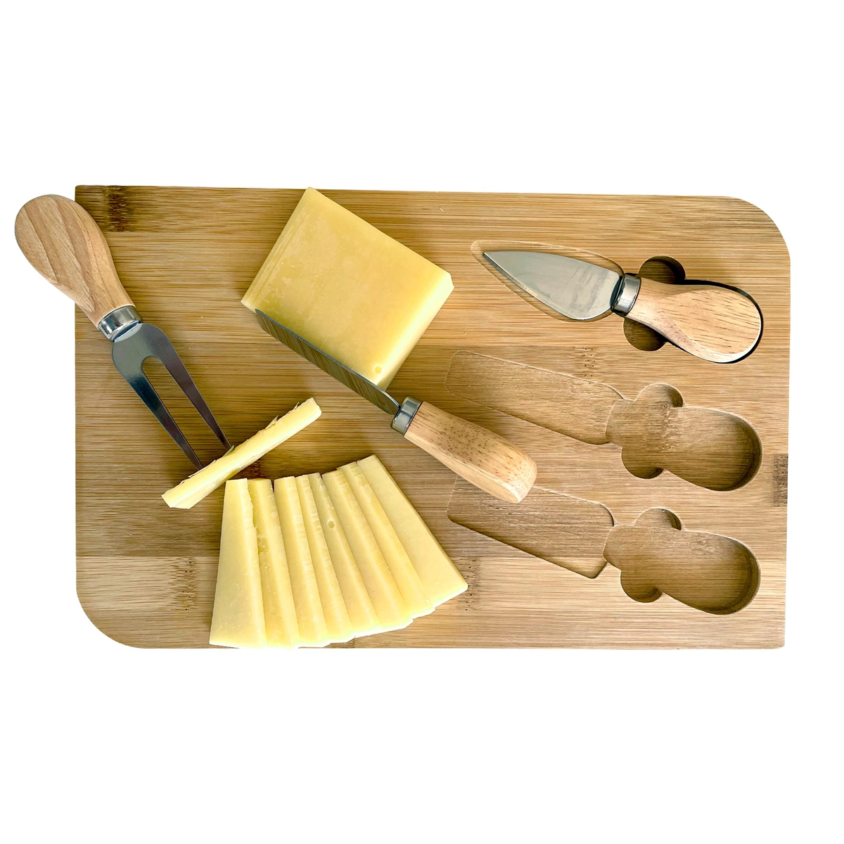 Tabla de bambú con set de 3 utensilios de acero inoxidable 210 con mango de madera: 2 cuchillos y 1 tenedor. Tabla para cortar y presentar diferentes quesos y fiambres. Medidas: 29,8 x 18,7 x 1,2 cm. Presentación en caja de regalo.