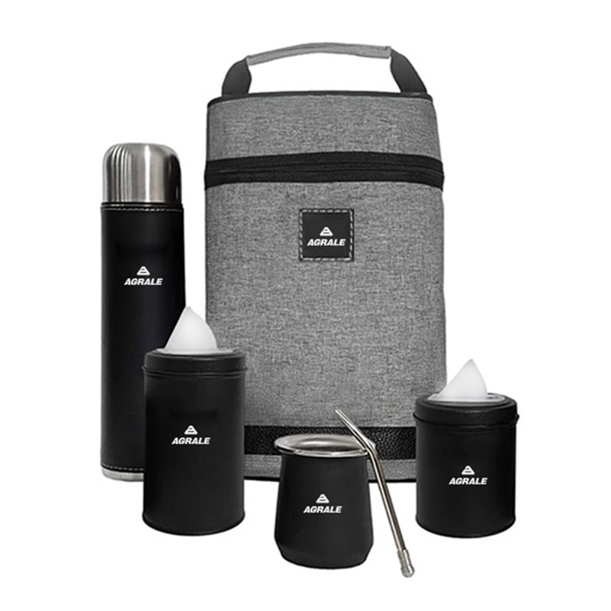 Equipo matero PREMIUM: Bolso matero con manija de transporte. Contiene: termo de acero de 1 litro con tapa, yerbera y azucarera, todos forrados en eco-cuero. Mate de acero y bombilla resorte.